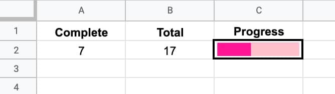 =SPARKLINE({A2/B2,1-A2/B2} , { "charttype","bar" ; "color1","#FF1493" ; "color2","#FFC0CB" })In our Sheet: