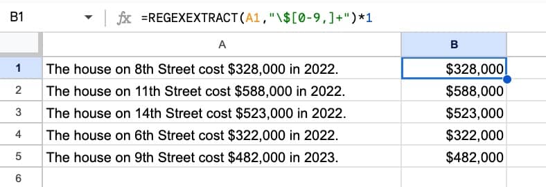 =REGEXEXTRACT(A1,"\$[0-9,]+")*1Output: 328000