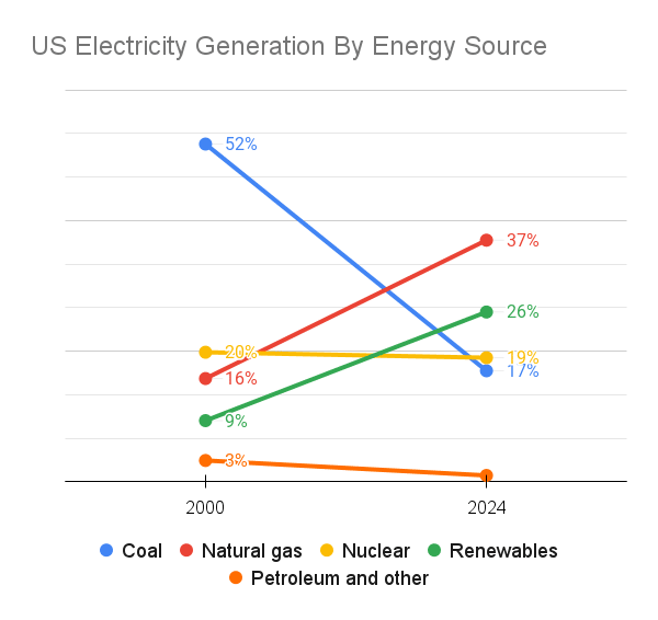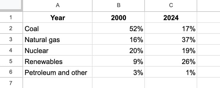 Greetings from sunny Harpers Ferry! ☀️ The rain has stopped (until tomorrow at least!) and I'm finally feeling better so I'm optimistic for the week ahead! Welcome to this issue of the Google Sheets Tips newsletter, #303, your Monday morning espresso, in spreadsheet form! Wow, that's a lot of exclamation points in the first few sentences! Oops, that was another. It's the optimism I feel today ;) Today I want to share a data visualization technique for showing change between two periods. It's an effective way to show the change in variables before and after an event happens (e.g. employee effectiveness before and after training). By now many of you will already have access to the new Table feature in Google Sheets, and if not, you'll get it soon. Let me know what you think. (More details in the News section below.) A big thank you to this week's sponsors who help keep this newsletter free to read: ➜ NewsI. There's lots to like here so you'll definitely want to look out for this as it rolls out over the next few weeks. Find it under the Format menu of a Sheet near you... Read more on the Workspace blog >> II. Read more about bulk dropdown chips >> III. Martin Hawksey provides an update for developers on how to handle these changes, in this article: Allowing access on behalf of the user >> _______ ➜ Google Sheets Tip #303: Show changes with a SlopegraphLet's look at slopegraphs in today's tip. Slopegraphs are a special type of line graph that shows the change between only two points. They work well to show change because they're easy to interpret. We can understand the changes because the chart is simple. Consider this chart that shows the change in energy source for electricity generation in the US, between 2000 and 2024: It's easy to see how reliance on coal has fallen dramatically and natural gas and renewable energy sources have filled that gap. Let's see how to create this chart in Google Sheets. The dataset for this exercise is available in this template: How to create a slopegraph in Google Sheets