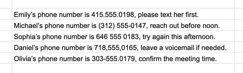 Ensure that it will work to capture any telephone numbers in these sorts of standard type formats with commas, periods, parentheses, and dashes, etc.