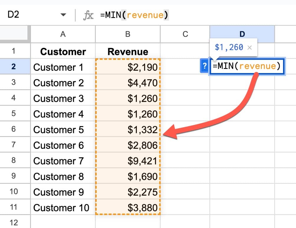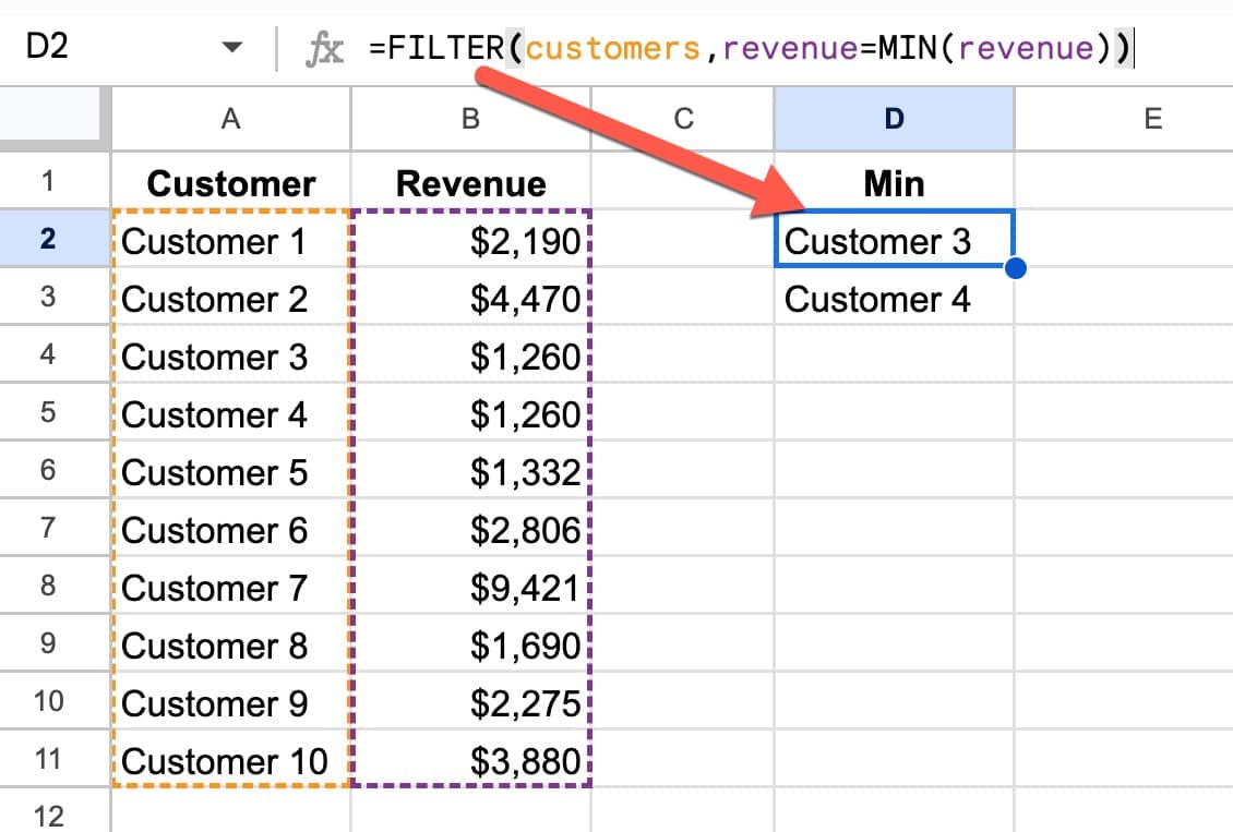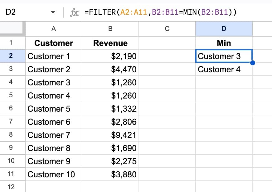 Welcome to the Google Sheets Tips newsletter #292, your Monday morning espresso, in spreadsheet form! Quick question before this week's email: If you use Apps Script, what do you use it for? Follow up, what pain points do you have? (Feel free to just hit reply to this email.) A big thank you to this week's sponsors who help keep this newsletter free to read: ➜ New videos on YouTube🎥 Count Specific Days Between Two Dates in Google Sheets (inspired by last week's newsletter on counting Mondays) _______ ➜ Google Sheets Tip #292: Finding minimum and maximum names from valuesSuppose we have this dataset: We want to identify the customers with the minimum and maximum revenues. There are many ways to do this, including pivot tables, sorting the data, formulas, etc. Today, we'll use the powerful FILTER function to find the min/max customers. First, find the minimum revenue value with this MIN formula: =MIN(B2:B11)With the data shown above, this gives us the result of $1,260. Now, we want to find the customers associated with this value. To do that, let's use the FILTER function. The filter formula returns values that satisfy specific conditions. It takes two arguments, firstly a range to filter and secondly, the conditions to apply. We want to find the customer names for the minimum values, i.e. we want to filter the names. So the first argument in the FILTER is the customer names range in A2:A11. The second argument of our FILTER — the conditions to test — is a test to find when the revenue values (B2:B11) are equal to the minimum value. We already found the minimum with the MIN formula above. Hence, our complete formula is: =FILTER(A2:A11,B2:B11=MIN(B2:B11))In our Sheet: I like the FILTER function because it returns more than one result if there are multiple customers with the minimum value. Find the Top Customer(s) with MAXTo calculate the top customer, swap the MIN function for a MAX function in the formula. Neater with Named RangesDo you use named ranges? They're a method for attaching names to cell ranges in your Sheets. Then, instead of referring to a range as B2:B11 in your formulas, you can use the name, e.g. revenue. To create a named range, highlight our data (e.g. B2:B11) and go to the menu: Data > Named ranges Enter a name in the name box and click Done. Now we can use this named range inside our formulas and it points to the correct range. For example, the MIN formula above becomes: =MIN(revenue)Which, in our Sheet, looks like this: If we name the range A2:A11 as customers, then our complete FILTER formula becomes even cleaner: =FILTER(customers,revenue=MIN(revenue))In our Sheet: _______ If you enjoyed this newsletter, please forward it to a friend who might enjoy it. Have a great week! Cheers, P.S. Anyone else do this? |